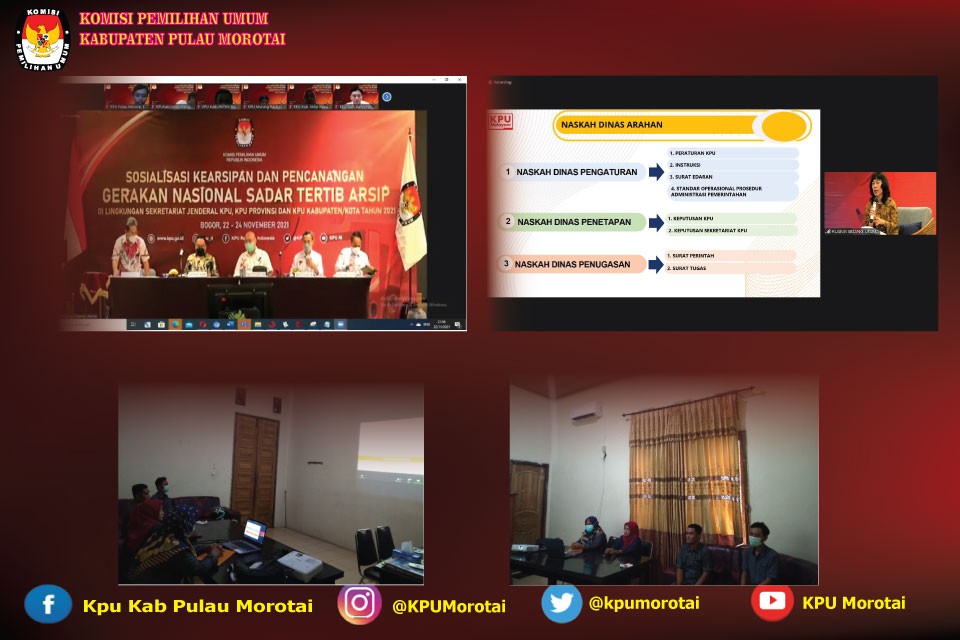 Pulau Morotai - KPU Kabupaten Pulau Morotai mengikuti Sosialisasi Kearsipan dan Pencanangan Gerakan Nasional Sadar Tertib Arsip. Kegiatan ini berlangsung dari 22-24 November 2021, secara daring. Ketua KPU RI Ilham Saputra bersama Anggota KPU RI Pramono Ubaid Tanthowi serta Deputi Bidang Administrasi Purwoto Ruslan Hidayat dan Kepala Biro Umum Setjen KPU RI M. Syahrizal Iskandar membuka Sosialisasi Kearsipan dan Pencanangan Gerakan Nasional Sadar Tertib Arsip.