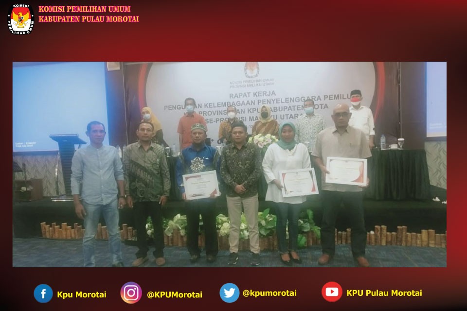 KPU Pulau Morotai Meraih 3 Penghargaan Ternate – ( 11/10/2021 ), Komisioner dan Sekretaris KPU kabupaten Pulau Morotai mengikuti kegiatan Rapat Kerja dalam Rangka Penguatan Kelembagaan Penyelenggara Pemilu, KPU Provinsi dan KPU Kabupaten/Kota se-Provinsi Maluku Utara. Kegiatan tersebut berlangsung dari 10 -12 Oktober 2021 di Ternate. Disela-sela kegiatan, diberikan penghargaan kepada KPU Kabupaten/Kota Se-Maluku Utara. Adapun KPU Kabupaten Pulau Morotai membawa pulang 3 penghargaan : Penghargaan kategori Bebas dari Sanksi Peringatan dari DKPP dan KPU RI yang diterima langsung oleh Irwan Abbas, selaku ketua KPU Kabupaten Pulau Morotai. Penghargaan Kategori Inovasi Rumah Pintar Pemilu yang diterima langsung oleh Amina Failisa selaku Koordinator Divisi Sosialisasi, Pendidikan Pemilih, Partisipasi Masyarakat dan SDM. Peringkat Ke 2, kategori Pengelolaan Keuangan Terbaik Hasil Audit Inspektorat KPU RI pada Pelaksanaan Anggaran Semester 1 Tahun 2021 yang diterima langsung oleh Hamid Ahe, selaku sekretaris KPU Kabupaten Pulau Morotai. “Penghargaan yang diraih cambuk dan penyemangat bagi KPU Pulau Morotai untuk bisa bekerja lebih baik lagi”. Hal ini disampaikan oleh Irwan Abbas, Ketua KPU Kabupaten Pulau Morotai. Hal senada disampaikan oleh Hamid Ahe, sekretaris KPU Kabupaten Pulau Morotai, “yang menjadikan penghargaan ini sebagai pemacu untuk terus berprestasi dan melakukan yang terbaik dalam bekerja”. Selain itu, Amina Failisa selaku koordinator divisi Sosdiklih “menjadikan penghargaan ini sebagai penyemangat untuk terus berkreasi dan berinovasi dalam menjalankan pekerjaan”. Faisal Aba, Arfandi Iskandar Alam dan Iswan Muhammad juga memberikan tanggapan positif atas hasil yang diraih, dan siap untuk berprestasi lebih baik lagi.