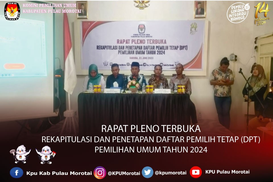 Pulau Morotai - Rabu, (21/06) Bertempat di Antrimel Resto, KPU Kabupaten Pulau Morotai melaksanakan Rapat Pleno Terbuka Rekapitulasi dan Penetapan Daftar Pemilih Tetap (DPT) Pemilihan Umum tahun 2024, Hasil rapat Rekapitulasi DPT, yaitu Jumlah Pemilih : 52.516, terdiri dari pemilih Laki-laki : 26.647, dan Pemilih Perempuan : 25.869 yang tersebar di 230 TPS dalam 88 desa se-kabupaten Pulau Morotai.