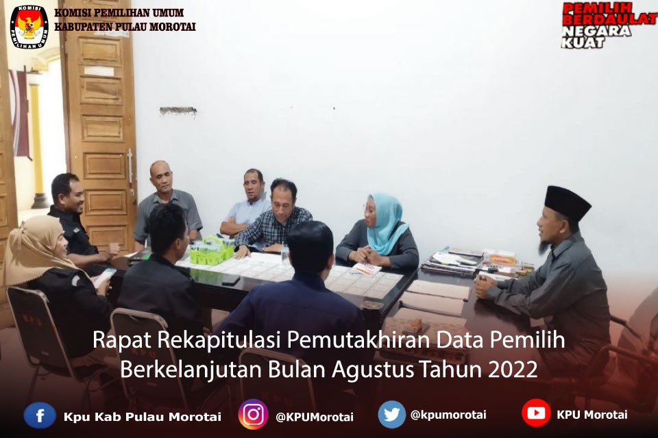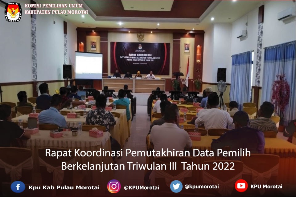 Pulau Morotai - Jum’at, ( 30/09 ) bertempat di Hotel Perdana, KPU Kabupaten Pulau Morotai Menggelar Rapat Koordinasi Pemutahiran Data Pemilih Berkelanjutan Periode Triwulan III Tahun 2022. Rapat dipimpin oleh Plh. Ketua KPU Kabupaten Pulau Morotai, Amina Failisa, didampingi oleh anggota KPU Kabupaten Pulau Morotai, Iswan Muhammad, Arfandi Iskandar Alam, beserta jajaran sekretariat KPU Kabupaten Pulau Morotai. Dari hasil rekapitulasi, data pemilih periode Triwulan III tahun 2022 berjumlah 50.781 dengan rincian pemilih laki-laki 25.889 dan pemilih perempuan 24.892 yang tersebar di 6 kecamatan. Kenaikan jumlah pemilih sebanyak 2.338 dari periode sebelumnya dikarenakan adanya pemilih pindah masuk sebanyak 3.263, sedangkan jumlah pemilih yang tidak memenuhi syarat adalah pemilih ganda 189, pemilih tidak dikenal 728, POLRI 8. Pemilih yang mengubah elemen data sebanyak 14.175, mengubah alamat asal sebanyak 111, dan mengubah alamat tujuan sebanyak 111 pemilih. Dalam kesempatan ini, Ketua Divisi Perencanaan, Data, dan Informasi KPU Kabupaten Pulau Morotai, Iswan Muhammad juga mensosialisasikan aplikasi Lindungi Hakmu, serta menerima masukan dari peserta. Hadir dalam rapat koordinasi tersebut BAWASLU Kab Pulau Morotai, Dukcapil Pulau Morotai, Kepala Desa di Kec. Morotai Selatan, Danramil Morotai Selatan, Kapolres, Danlanud, Danlanal Pulau Morotai, serta Partai Politik Peserta Pemilu Tahun 2019.