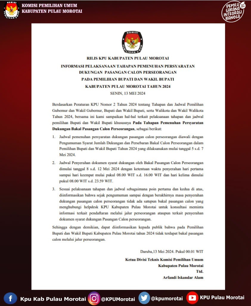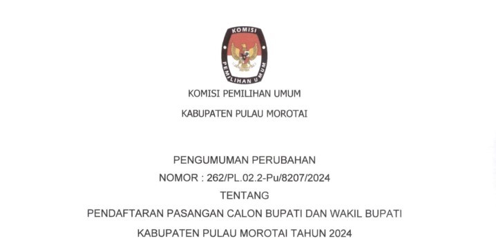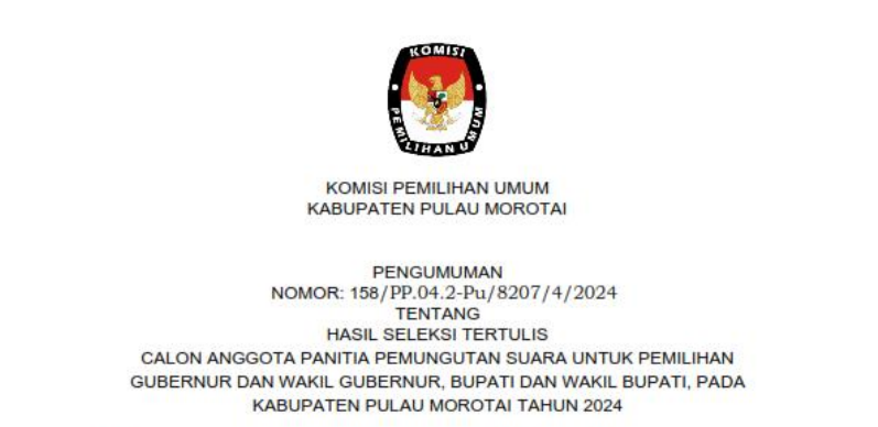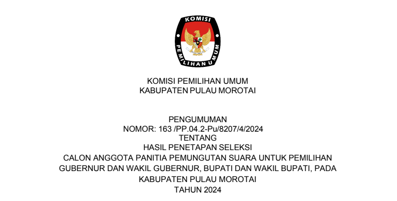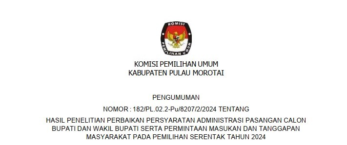 Pulau Morotai - Pengumuman Nomor 182/PL.01.9-PU/8207/2/2024 Tentang Calon Terpilih Anggota DPRD Kabupaten Pulau Morotai Pemilihan Umum Tahun 2024, Informasi selengkapnya KLIK DISINI