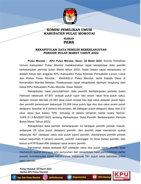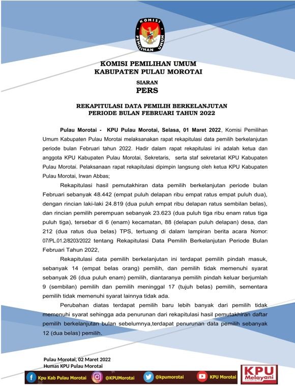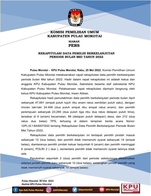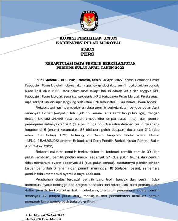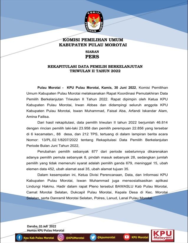 Pulau Morotai - KPU Pulau Morotai, Rabu, 25 Mei 2022, Komisi Pemilihan Umum Kabupaten Pulau Morotai melaksanakan rapat rekapitulasi data pemilih berkelanjutan periode bulan Mei tahun 2022. Hadir dalam rapat rekapitulasi ini adalah ketua dan anggota KPU Kabupaten Pulau Morotai, serta staf sekretariat KPU Kabupaten Pulau Morotai. Pelaksanaan rapat rekapitulasi dipimpin langsung oleh ketua KPU Kabupaten Pulau Morotai, Irwan Abbas; Rekapitulasi hasil pemutakhiran data pemilih berkelanjutan periode bulan April sebanyak 47.691 (empat puluh tujuh ribu enam ratus sembilan puluh satu), dengan rincian laki-laki 24.406 (dua puluh empat ribu empat ratus enam), dan pemilih perempuan sebanyak 23.285 (dua puluh tiga ribu dua ratus delapan puluh lima), tersebar di 6 (enam) kecamatan, 88 (delapan puluh delapan) desa, dan 212 (dua ratus dua belas) TPS, tertuang di dalam lampiran berita acara Nomor: 12/PL.02.1-BA/8207/2022 tentang Rekapitulasi Data Pemilih Berkelanjutan Periode Bulan Mei Tahun 2022, Rekapitulasi data pemilih berkelanjutan ini terdapat pemilih pindah masuk sebanyak 12 (dua belas), dan pemilih tidak memenuhi syarat sebanyak 14 (empat belas), diantaranya pemilih pindah keluar berjumlah 6 (enam) dan pemilih meninggal 6 (enam), POLRI 2 ( dua ), sementara pemilih tidak memenuhi syarat lainnya tidak ada. Perubahan sejumlah 2 (dua) pemilih dari periode sebelumnya dikarenakan adanya jumlah pemilih baru sebanyak 12 (dua belas), sedangkan jumlah pemilih yang tidak memenuhi syarat sebanyak 14 (empat belas).